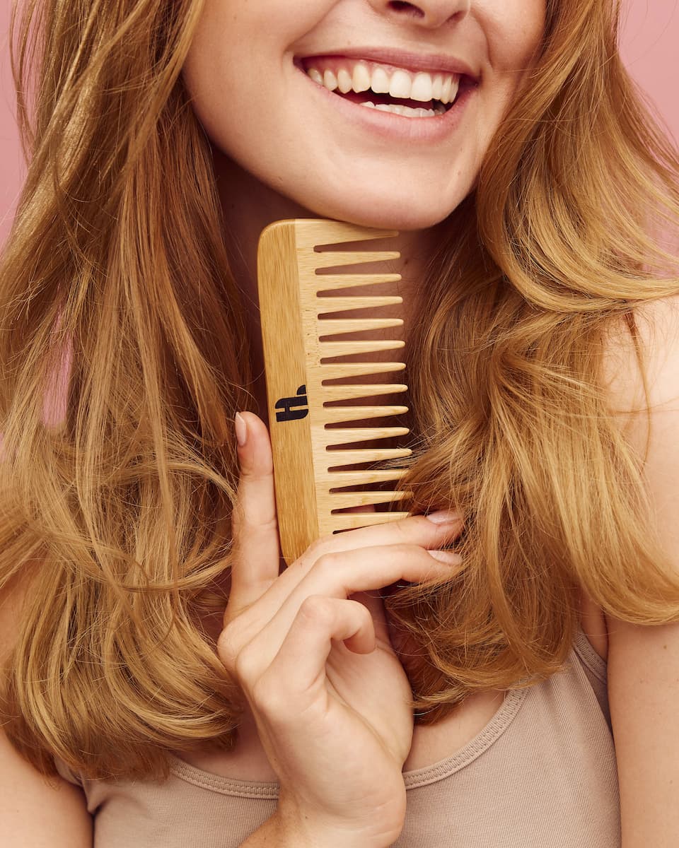 Bid farewell to pulling and damage. Our wide-tooth Bamboo Comb smoothly glides through your hair, gently detangling knots without tugging or causing breakage.