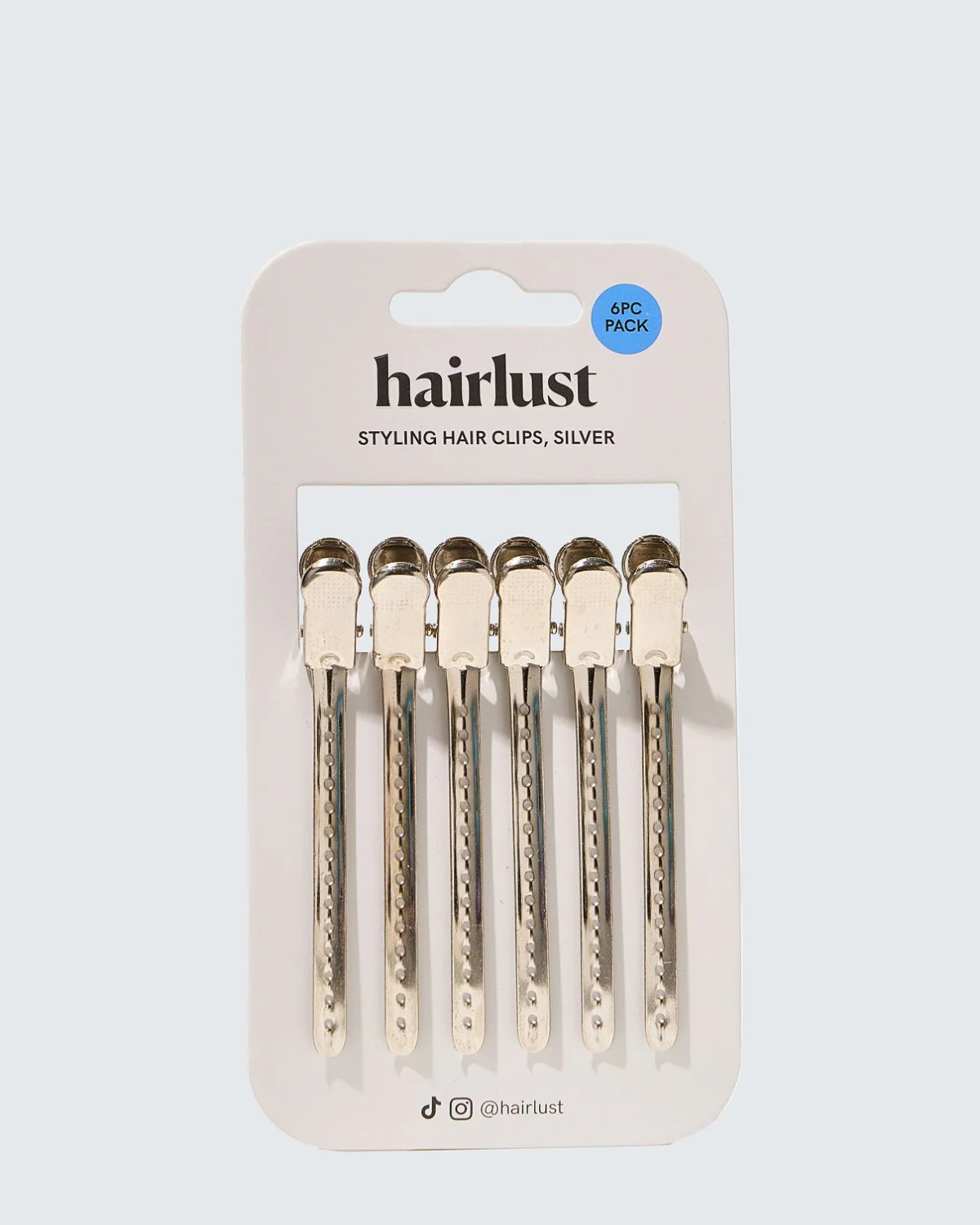 Keep your hair perfectly in place with these Styling Hair Clips. This 6-pack of sleek silver metal hair clips is crafted from high-quality, lightweight stainless steel, offering both durability and a reliable hold. Perfect for a variety of styling needs—whether you're cutting, curling, blow-drying, flat ironing, or creating beachy waves and polished updos—these versatile metal hair clips have you covered. Designed for all hair types, these hair clips for sectioning provide a secure grip and hold on both wet and dry hair, making them an essential tool for any hair care routine.