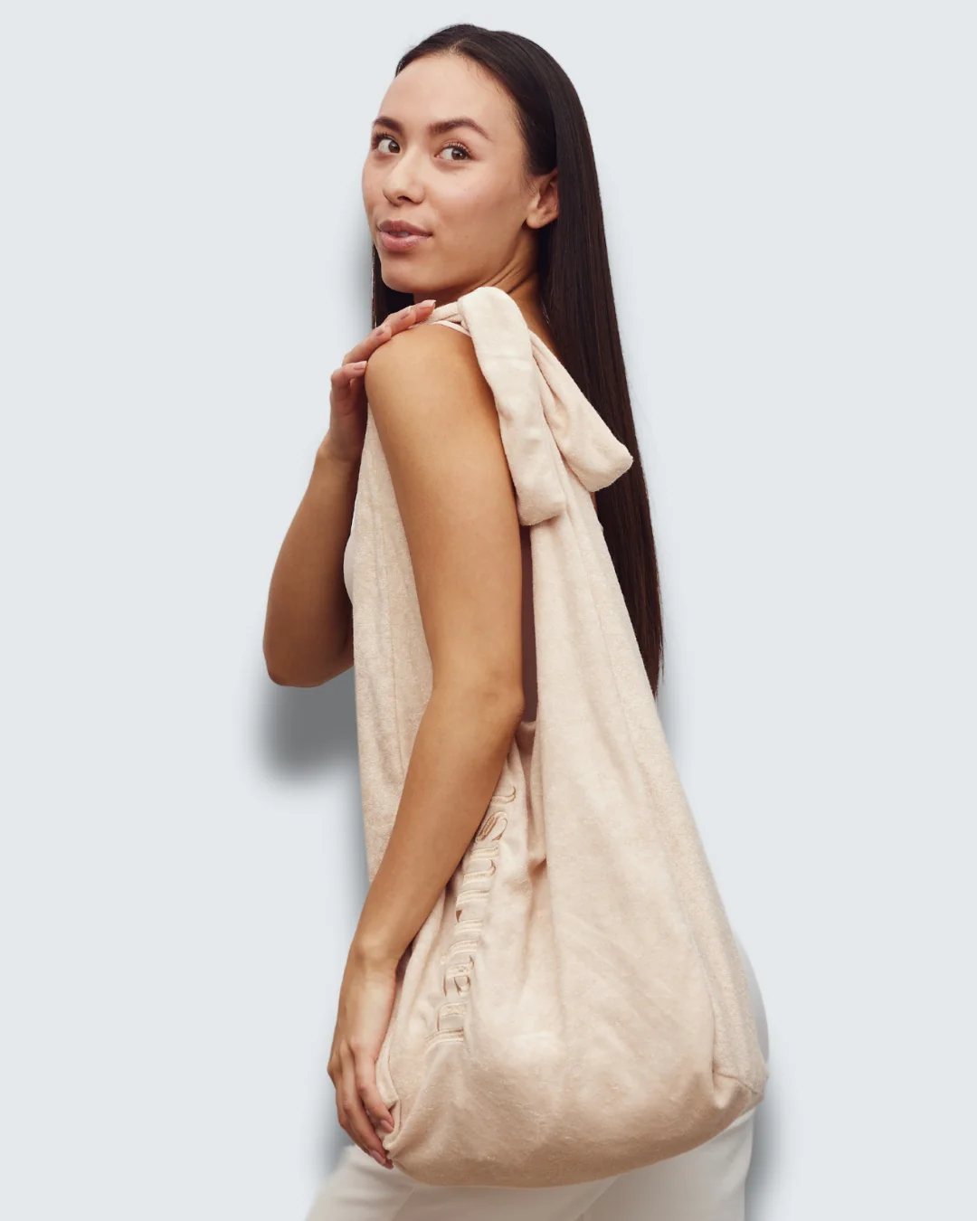 Lightweight terrycloth tote with adjustable knot handle for versatile styling.